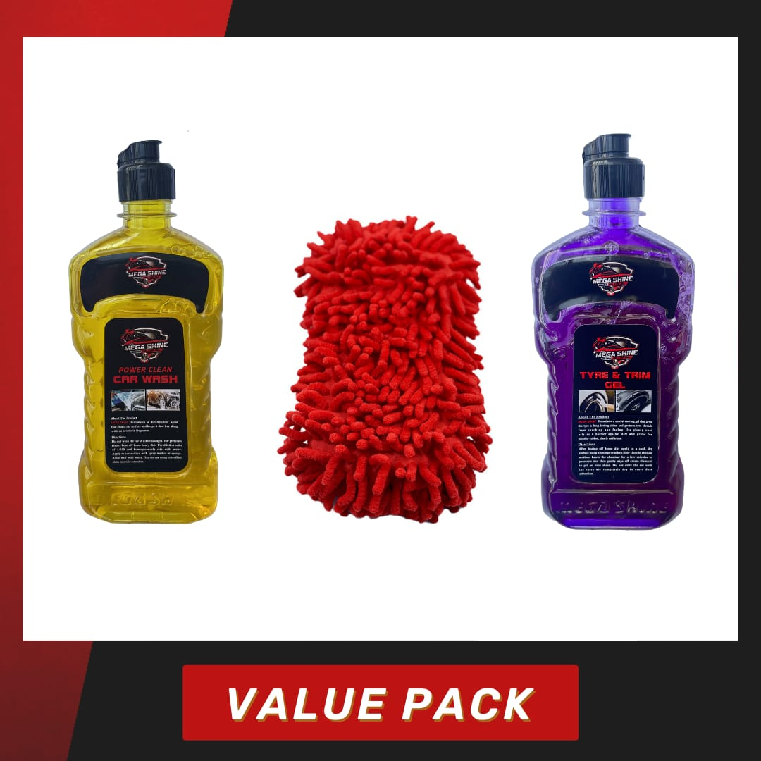 Value Pack Contains : 1 x Mega Shine Power Clean Car Wash Shampoo 450ML, 1 x Mega Shine Tire & Trim Gel 450ML, 1 x Car Cleaning Microfiber Wash Mitt Blue
